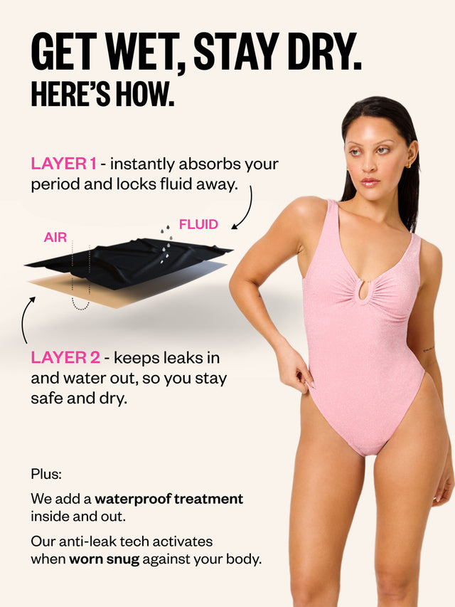 Stürze dich in den Pool und meistere die Wellen mit unserer Auswahl an auslaufsicheren Bikinis. Unsere Bikinihöschen für die Periode sind so konzipiert, dass sie sich wie normale Schwimmerinnen anfühlen und aussehen. Sie verfügen über ein schnell trocknendes Futter, das bis zu zwei Tampons Blut oder Urin aufnehmen kann.